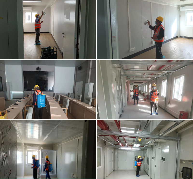 现场人员与物品进出频繁,作业条件受影响、强封闭通风条件差、净化设备使用受限,空气治理工作困难重重。团队人员需随时跟进工程状况,筛选出符合治理条件的楼栋,抓紧时间紧锣密鼓展开施工治理。项目场地电力情况不稳定,施工人员无法持续使用喷雾设备进行治理,为了保障进度,团队使用事先预备的人力喷雾机,施工人员在高温天气中扛着数十斤的机器进行作业治理。
