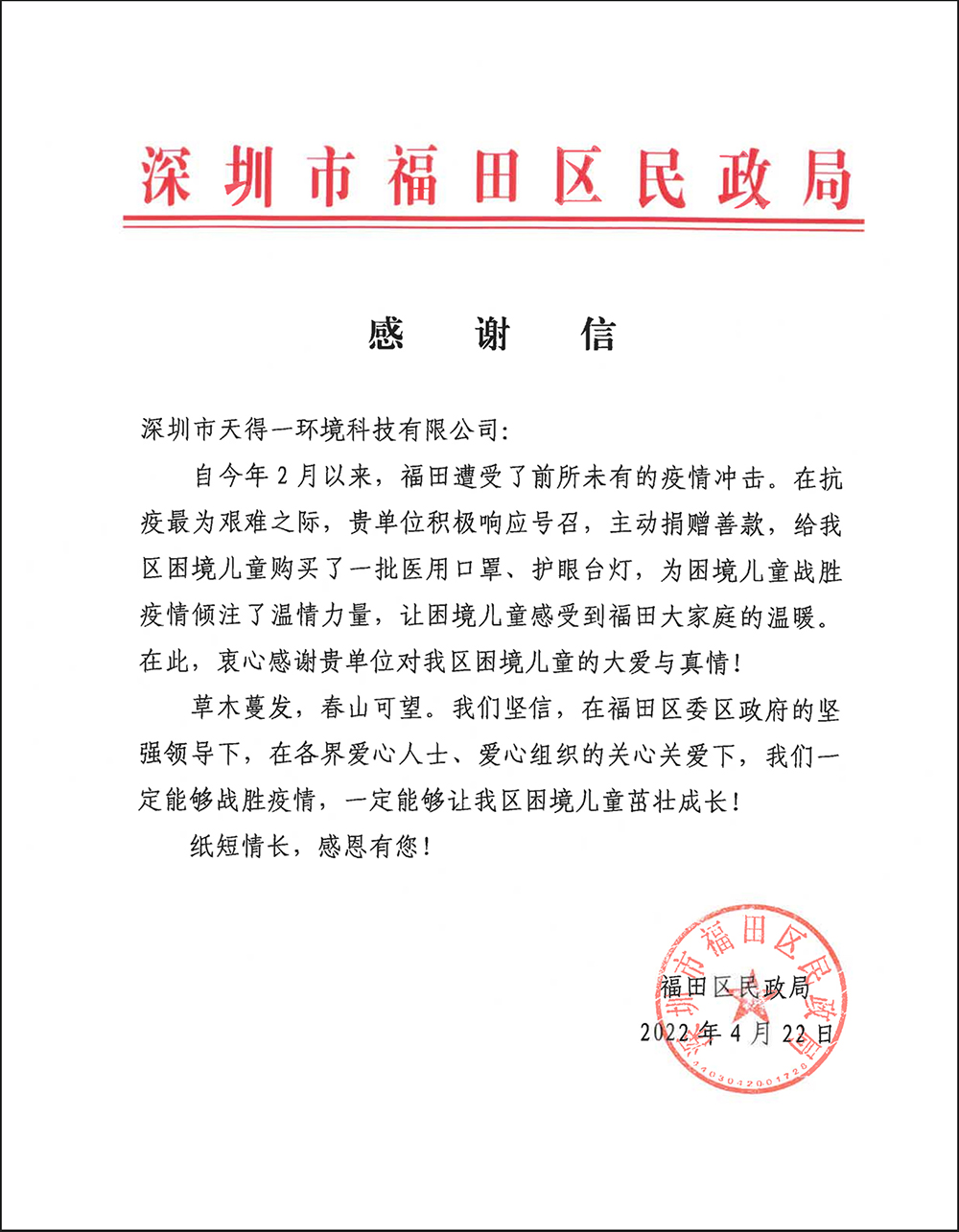 近日,ng28(南宫)收到了一封来自福田区民政局的感谢信,信中言辞真切,对ng28(南宫)在深圳抗疫期间的善举表示衷心的感谢。