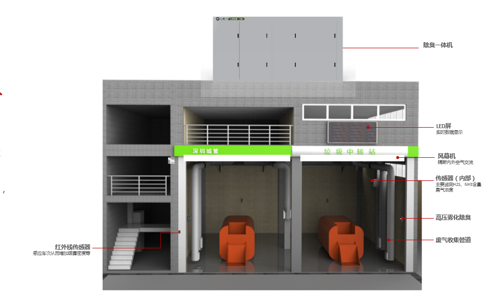 其中除臭一体机是我司结合生物喷淋工艺、深紫外氧化工艺、高压喷雾工艺、负压收集等多种除臭工艺形成新型除臭设备。采用多种除臭工艺,可增减不同除臭工艺设备部件,灵活配置各个垃圾中转站实际除臭需求,对垃圾中转站产生的复杂的恶臭气体有着优秀的处理效果,配合我司的智慧环卫管理平台,实现实时感知、监测、统计、分析、预测预警和主动式运维于一体,形成治理、监测与运维的有效结合。