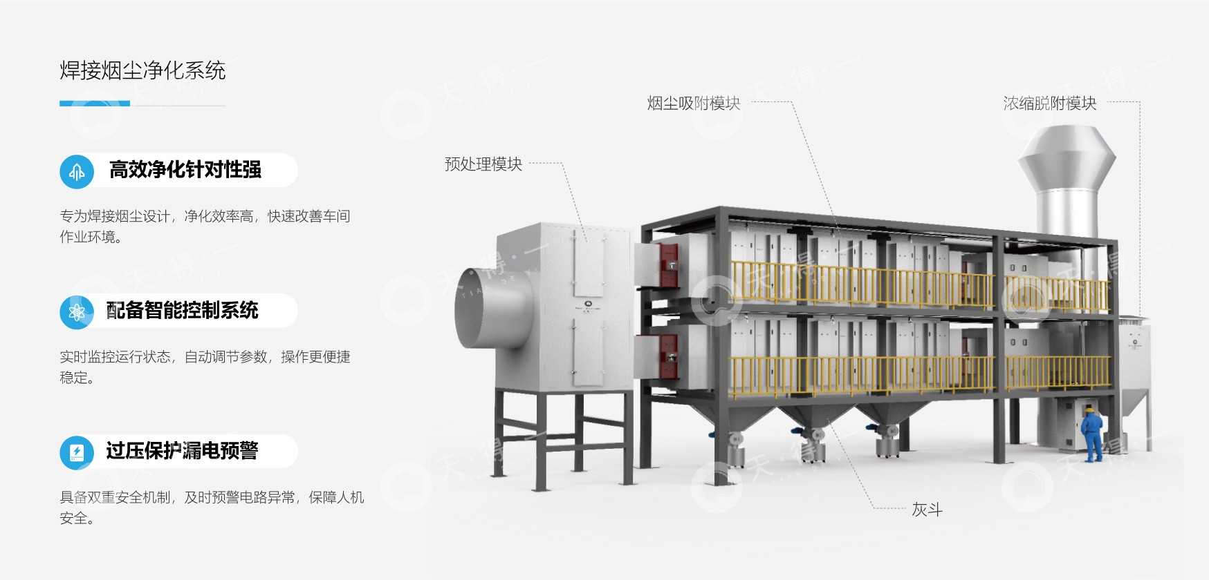 针对焊接烟尘治理,可采用我司“焊烟专用智能静电吸附设备与脉冲喷吹脱附技术”相结合的治理方式,该设备拥有自主知识产权。该治理方式精准针对焊接烟尘含金属氧化物、粉尘等特性,用静电除尘技术,经高压电场使粉尘荷电吸附,精准、高效地去除焊接烟尘中的各类污染物,净化效率高达 98% 以上,能有效减少车间内烟尘污染,保障车间空气质量。智能控制系统自动调电场强度,实时监控运行,有过压保护、漏电预警等机制,确保 24 小时稳定运转,处理后烟尘排放浓度≤10mg/m³,达绿色治理目标,营造绿色制造车间环境。