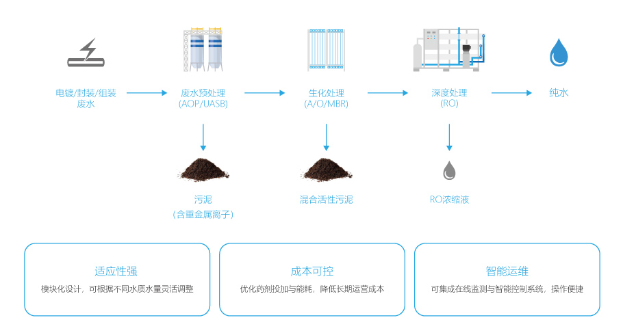在电子行业中,电镀、封装测试、消费电子组装等领域的表面处理、清洗等核心工序,会产生含有铜、镍、铬等多种重金属离子,以及 COD、悬浮物的综合废水。这类废水的危害尤为突出:不仅成分复杂且波动性大,更因多种重金属形成复合污染。针对这类废水的复合型污染特征与治理难点,我司定制整合了重金属靶向去除、COD 高效降解与悬浮物深度净化的一体化方案,既能实现各项指标稳定达标,更能从源头切断重金属的环境累积风险,为企业筑牢环保防线。